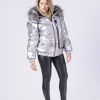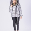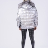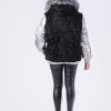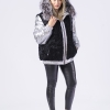 Reversible black swakara fur bomber with zip closure and hood trimmed with silver fox fur. 2 Side pockets. Front chest patch pocket with velcro closure and hidden zip compartment along left side of jacket with interior pocket. Elacticized cuffs and bottom hem.  Composition: 80% polyester 20% polyamide. Made in Greece